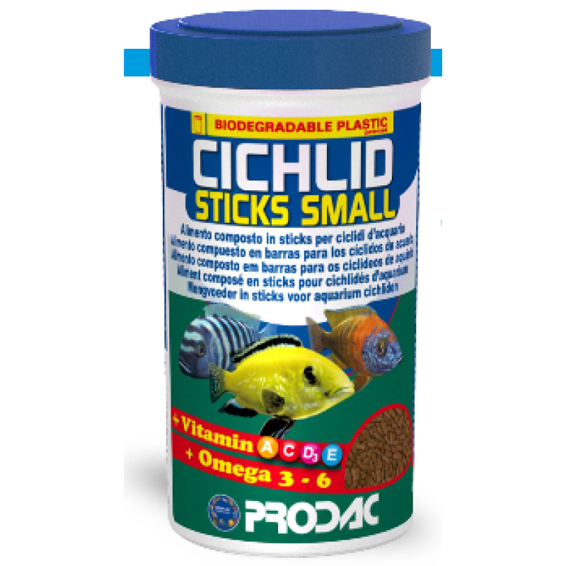 CICHLID STICKS SMALL visavertis pašaras lazdelėmis skirtas dideliems ciklidams kaip: Ciclasoma, Pseudotropheus, Astronomus. Pašaras tinkamas ir vandens vėžliukams, amfibijoms.