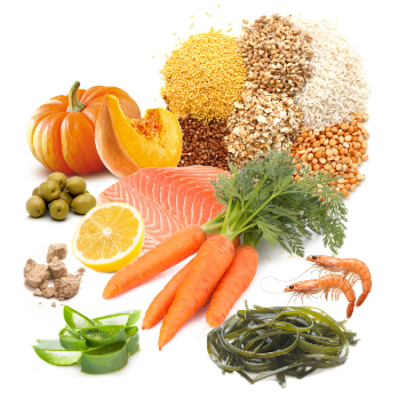 Sudėtis: javai, žuvis ir jos produktai, soja, mielės, vėžiagyviai, dumbliai 0.8%, alavijas 0,05%. EEC dažikliai.