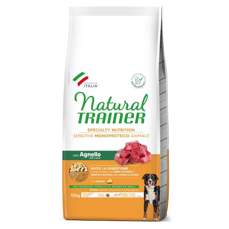NATURAL TRAINER ADULT DOG SENSITIVE NO GLUTEN M/M LAMB visavertis pašaras suaugusiems vidutinių ir didelių veislių šunims su ėriena.