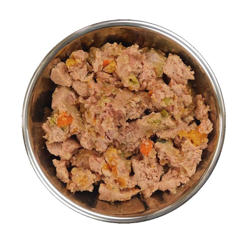 Sudėtis: Šviežios vištienos 85% (nukaulintos vištienos 60%, vištienos sultinio 25%), žirniai, batatai, morkos, cukinija, saulėgrąžų aliejus, lašišų aliejus, jūrinių dumblių miltai, liucernos, petražolės, salierai, cikorijų šaknys, dilgėlės, ciberžolė, anyžinių ožiažilių sėklos, mineralai.